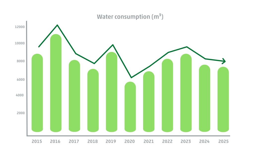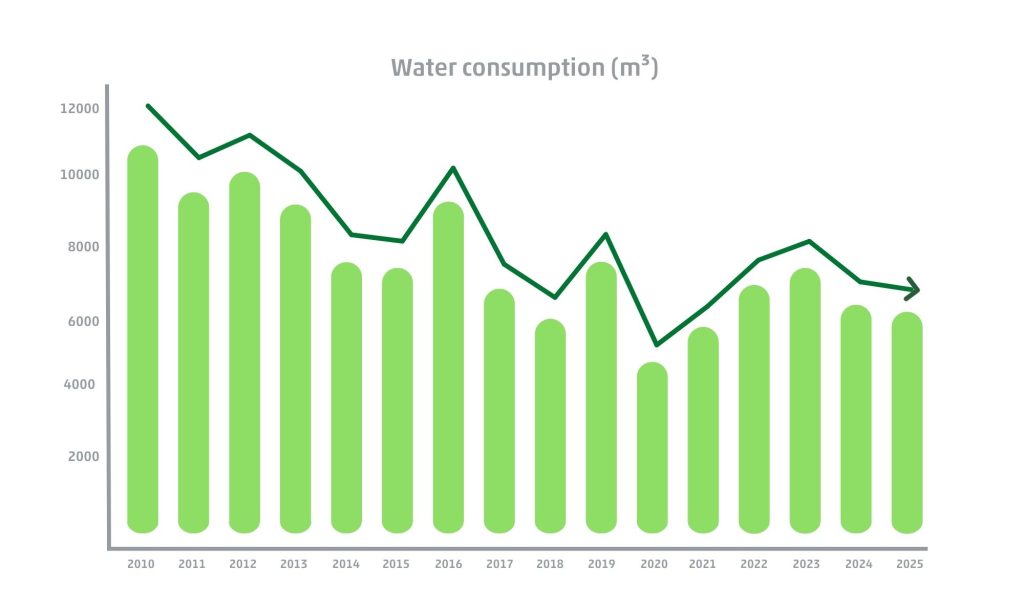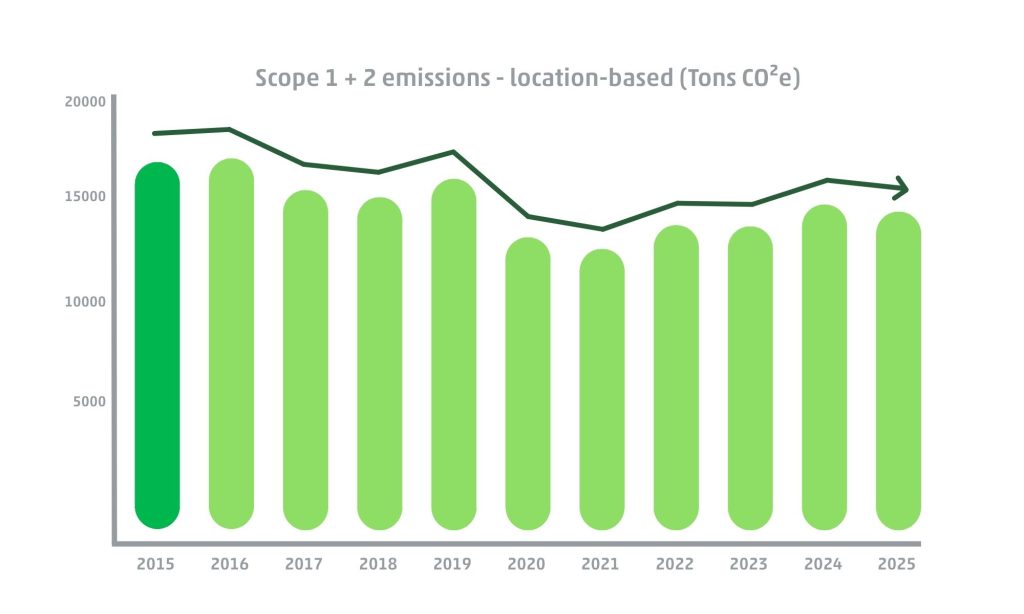 Since 2015, a gradual decrease in greenhouse gas emissions has been observed, driven by structural energy‑saving measures and further amplified by the slowdown in economic activity caused by the COVID-related impact on the aviation sector. Since then, production has returned to pre‑COVID levels, but in 2025 the downward trend in CO₂ emissions will resume, with a 2.6% reduction despite a 6% increase in activity, clearly demonstrating the effectiveness of the actions implemented.